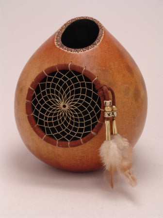 Want the great look of a woven dream catcher on your gourd, but don't want to do the weaving yourself? Try one of these pre-made dream catchers - see the photo below to see the great results you can get. Simply cut a hole in the gourd, drill a few holes, and lace the dream catcher onto the gourd! Feathers vary, no choice of color.