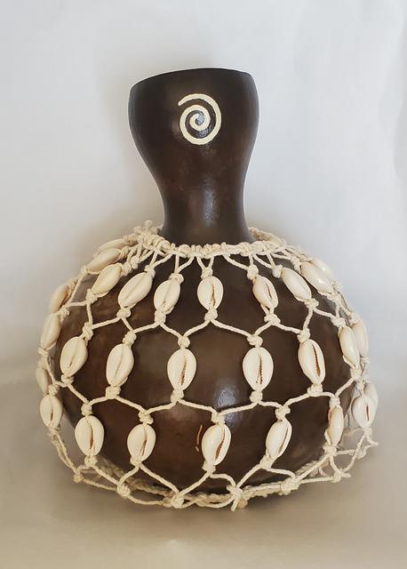 This lovely shekere features an infinity spiral and Kenyan Cowrie Shells. Height is approximately 9" and width is 7".