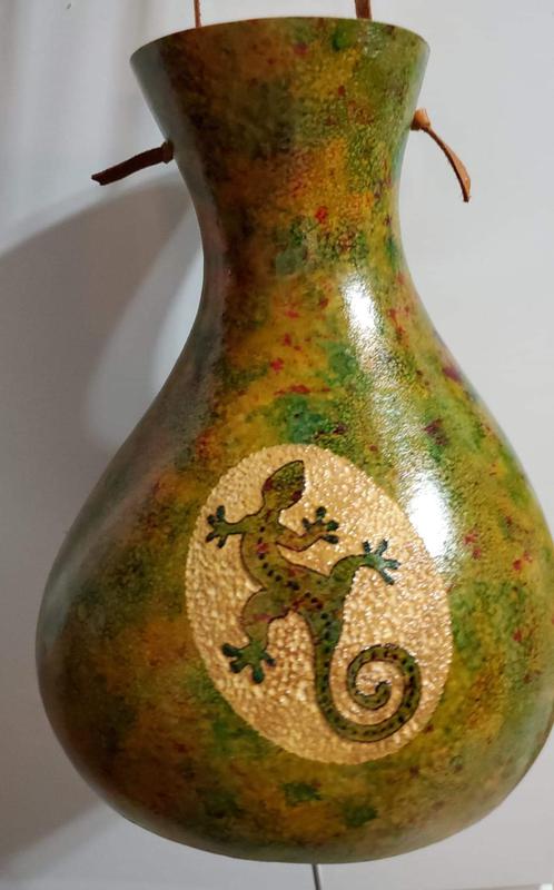 Thunder Gourds can be made with either rawhide or synthetic drum heads. To use a synthetic drum head, apply thick super glue along the bottom edge of the gourd and set on the uncut drum head. Let it dry thoroughly, then gently heat shrink to tighten with a heat gun or hair dryer, working from the center out. Trim the excess membrane with a hobby knife. Insert the spring in the center by pricking a small hole then inserting and gently twisting the spring up a few rows of the coil.